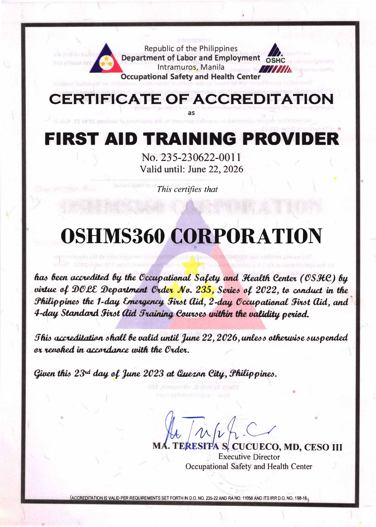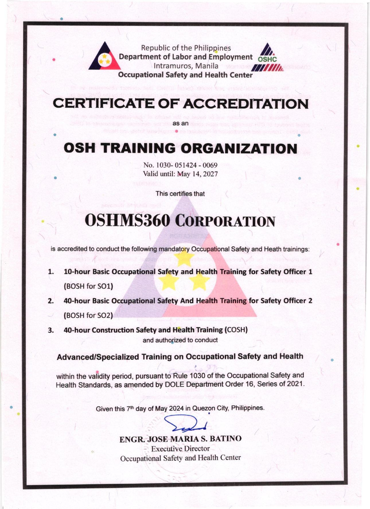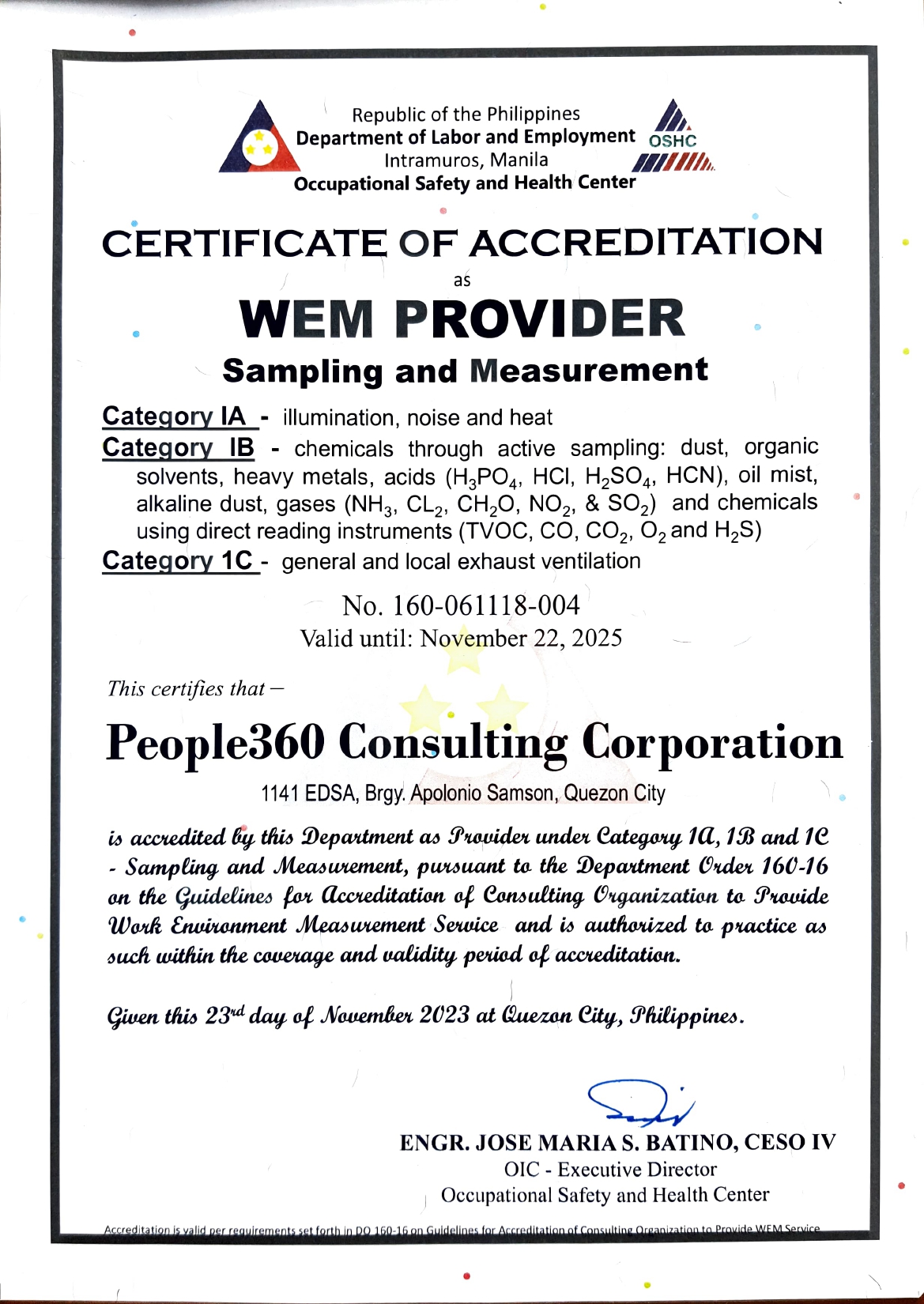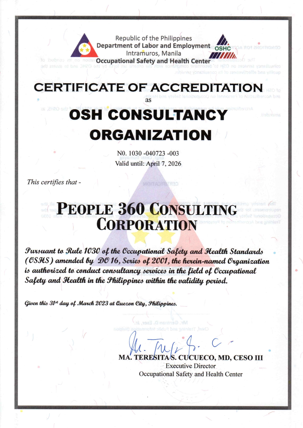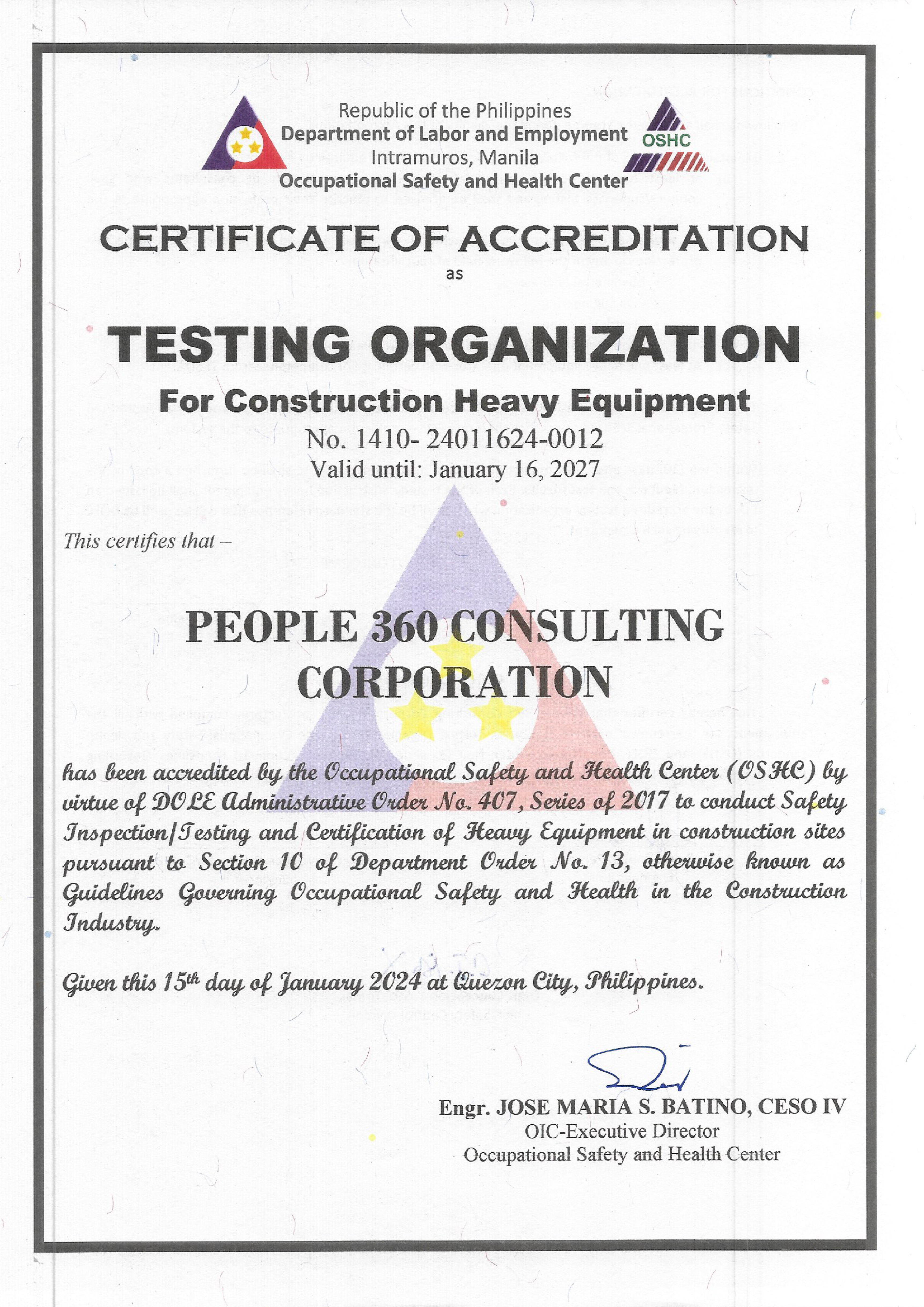 PEOPLE360 is the leading Safety Organization in the Philippines accredited by DOLE-OSHC to provide end-to-end solutions, namely Heavy Equipment Testing & Certification, Safety Consultancy, OSH Training, First Aid Training, Work Environment Measurement & Industrial Hygiene Laboratory (certified by the Professional Regulatory Board of Chemistry).