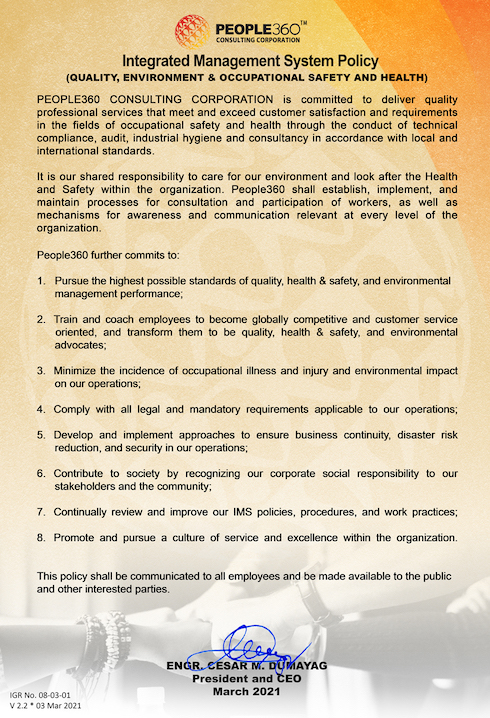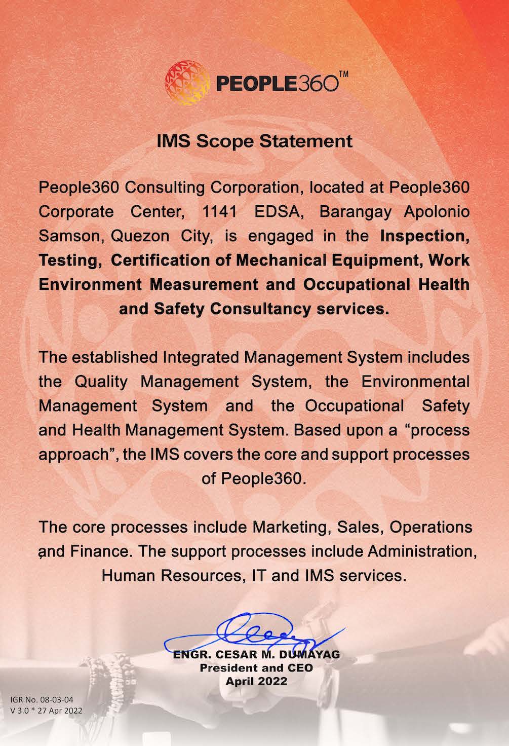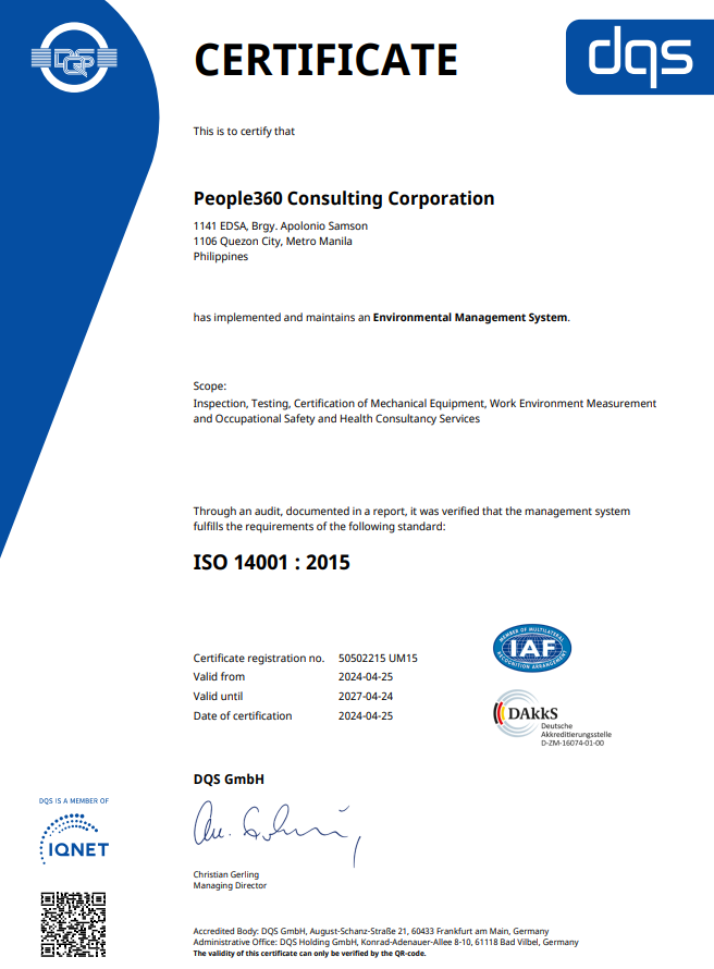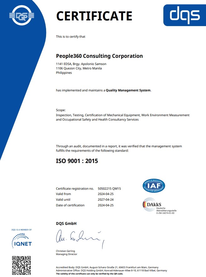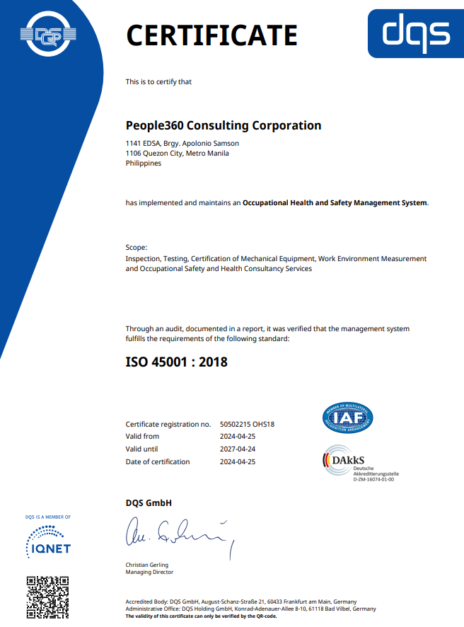 PEOPLE360 is the one and only organization in the Philippines engaged in the provision of Occupational Safety and Health (OSH) services to attain these Internal Standards Certifications. The Integrated Management System (IMS) certification issued by the DQS Certification Phil's Inc. to People360 certifies that it has been assessed as conforming to the following: