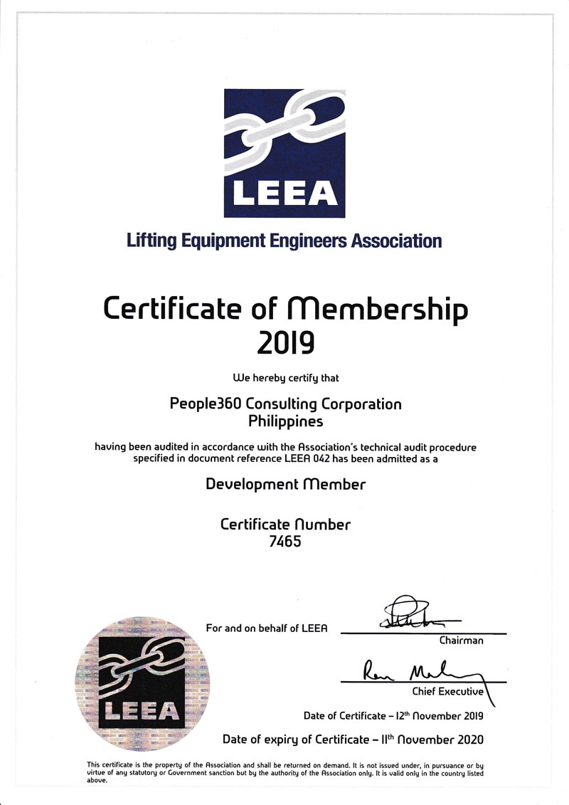 Congratulations People360 for another honor, for having been admitted as a Development Member of the Lifting Equipment Engineers Association (LEEA) after being audited in accordance with the Association’s technical audit procedure.