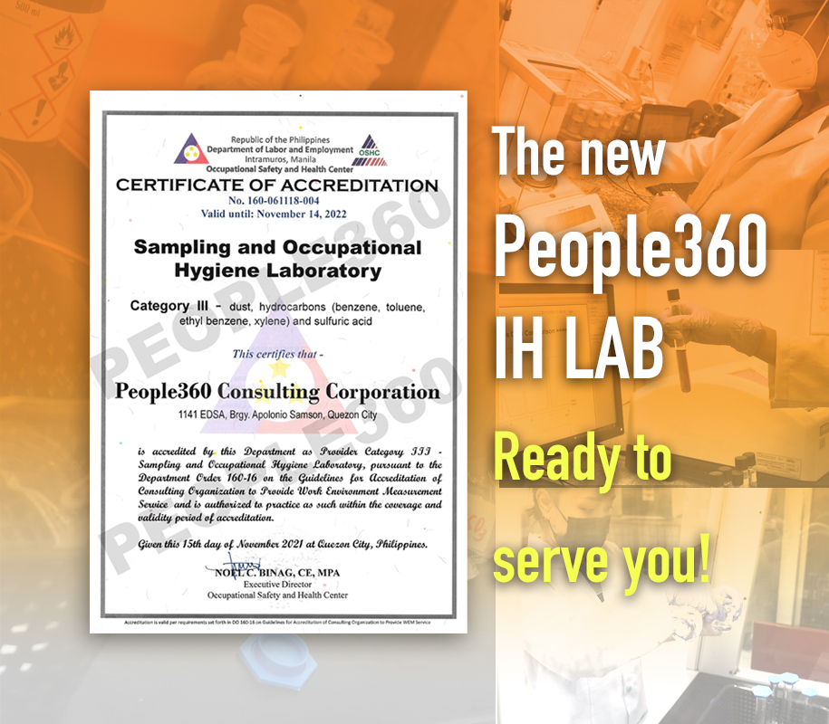 With the company's commitment to protecting the safety and health of every Juan, People360 now brings you its own Industrial Hygiene Laboratory! Accredited by the Occupational Safety and Health Center (OSHC), the IH Lab is one of the new projects of People360 that aims to deliver innovative Industrial Hygiene solutions through fast, quality, yet cost-effective analytical laboratory services.