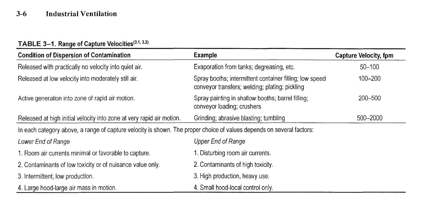 To evaluate the effectiveness of Local Ventilation an anemometer can be used to measure the velocity of the wind movement generated by the LEV at specific areas depending on the work, and then compared to the following standard: